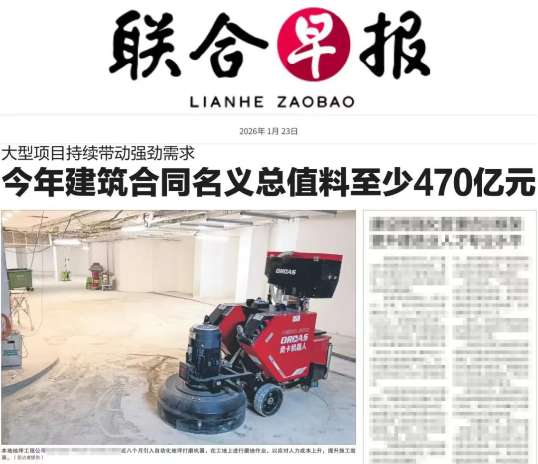 近日,新加坡《联合早报》刊发相关报道,提及本地建筑企业在投入使用奥卡地坪研磨机器人后,施工生产效率迎来大幅提升。此次新加坡《联合早