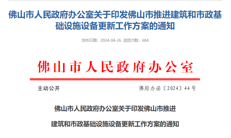 佛山市推进建筑和市政基础设施设备更新工作方案 为贯彻落实《国务院关于印发〈推动大规模设备更新和消费品以旧换新行动方案〉的通知》(