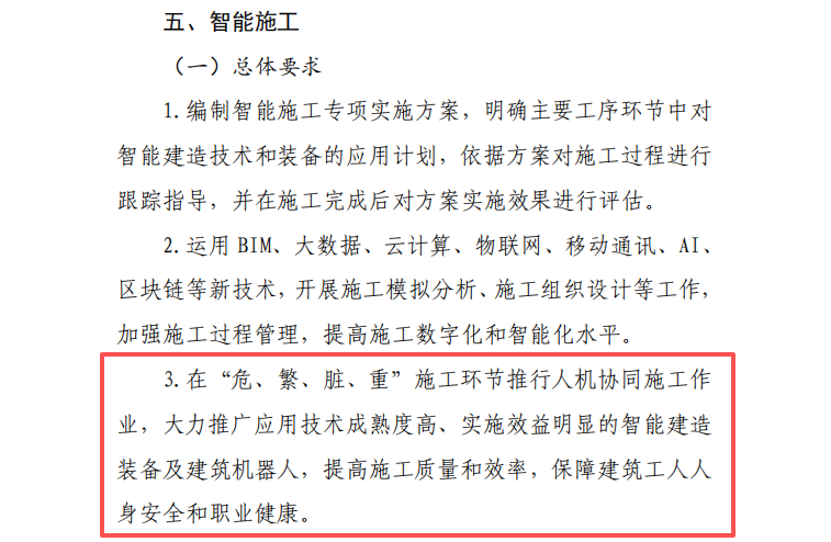 2025年3月17日,住房城乡建设部办公厅印发《智能建造技术导则(试行)》明确要求,在“危、繁、脏、重”施工环节推行人机协同施工作业,大力推广应用技术成熟度高、实施效益明显的智能建造装备及建筑机器人,提高施工质量和效率,保障建筑工人人身安全和职业健康。
