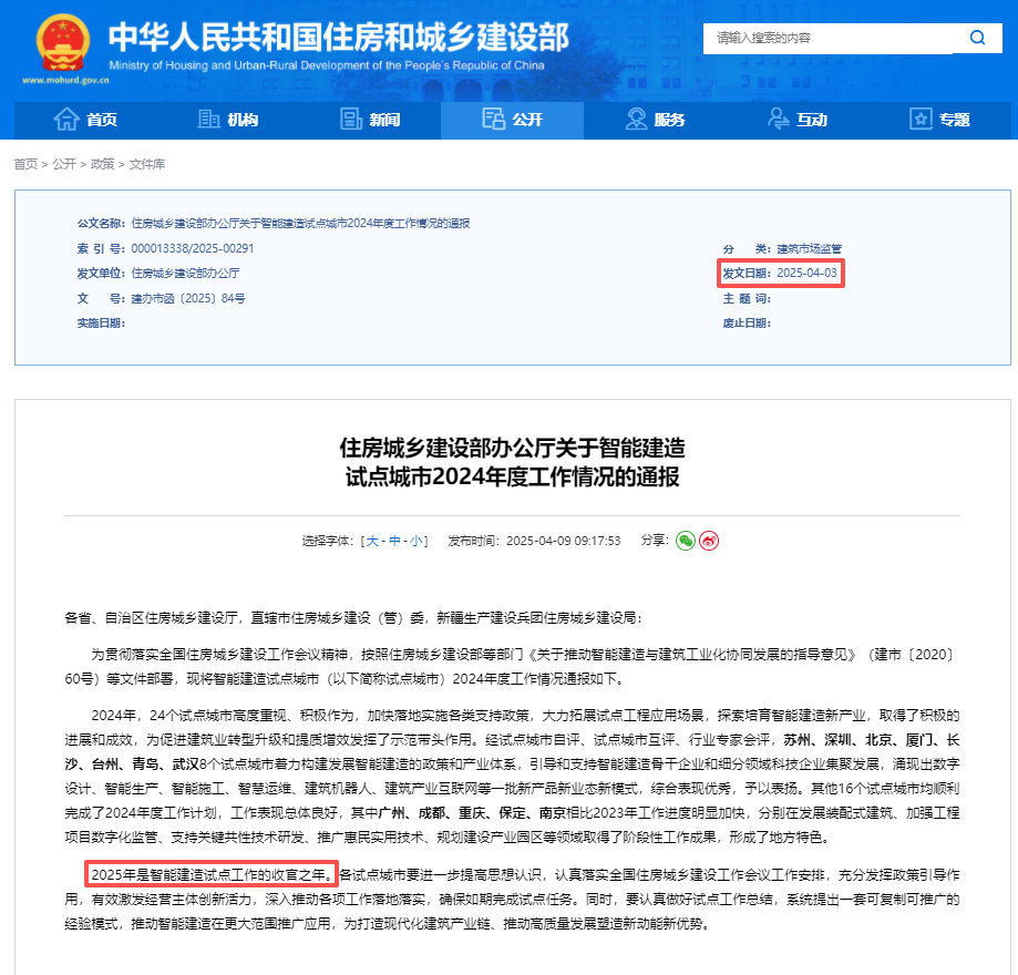 2025年4月3日,住房城乡建设部《关于智能建造试点城市2024年度工作情况的通报》。2024年,24个智能建造试点城市积极推进相关工作,在建筑机器人领域成果显著。其中苏州、深圳等8个综合表现优秀的试点城市,通过构建政策与产业体系、引导企业集聚,催生出建筑机器人等新产品新业态新模式,成为智能建造重要创新成果。