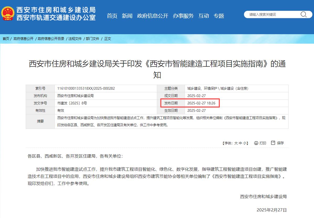 2025年2月27日,西安市住建局关于印发《西安市智能建造工程项目实施指南》的通知,明确建筑机器人及智能装备在智能化施工中的应用要求、应用比例、突发情况处置预案等方面的规定,确保施工过程中标准化作业,提高施工效率、质量及项目管理的智能化水平,推动智能建造与建筑工业化协同发展。