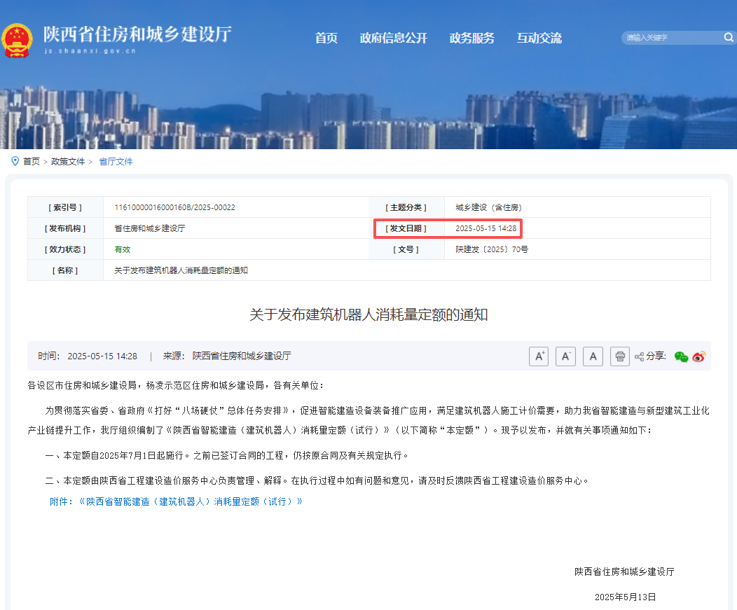 2025年5月15日,陕西省住房和城乡建设厅《关于发布建筑机器人消耗量定额的通知》,通过为建筑机器人施工提供明确的计价依据,促进智能建造设备装备推广应用,支持陕西省智能建造与新型建筑工业化产业链提升工作。该定额自2025年7月1日起施行。