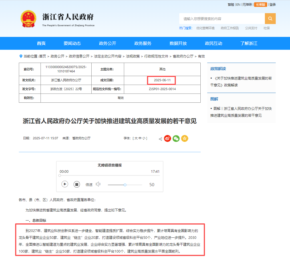 2025年6月11日,浙江省人民政府办公厅《关于加快推进建筑业高质量发展的若干意见》。研究建筑机器人技术标准、建筑产业互联网平台架构等共性标准,培育省级智能建造试点企业、试点项目并予以信用激励,支持试点项目创建优质工程。