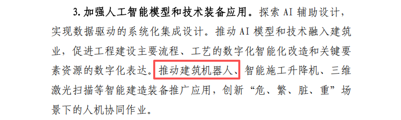 2025年9月1日,杭州市城乡建设委员会《关于加快推进智能建造的指导意见》,推动建筑机器人、智能施工升降机、三维激光扫描等智能建造装备推广应用,创新“危、繁、脏、重”场景下的人机协同作业。
