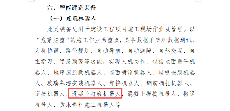 2025年5月21日,深圳市住房和建设局《深圳市智能建造技术目录(第三版)》,目录分为七大技术项,其中的智能建造装备项中,要求以“危繁脏重”的施工作业为重点,实现人机协作,包括混凝土打磨机器人、搬运机器人等。