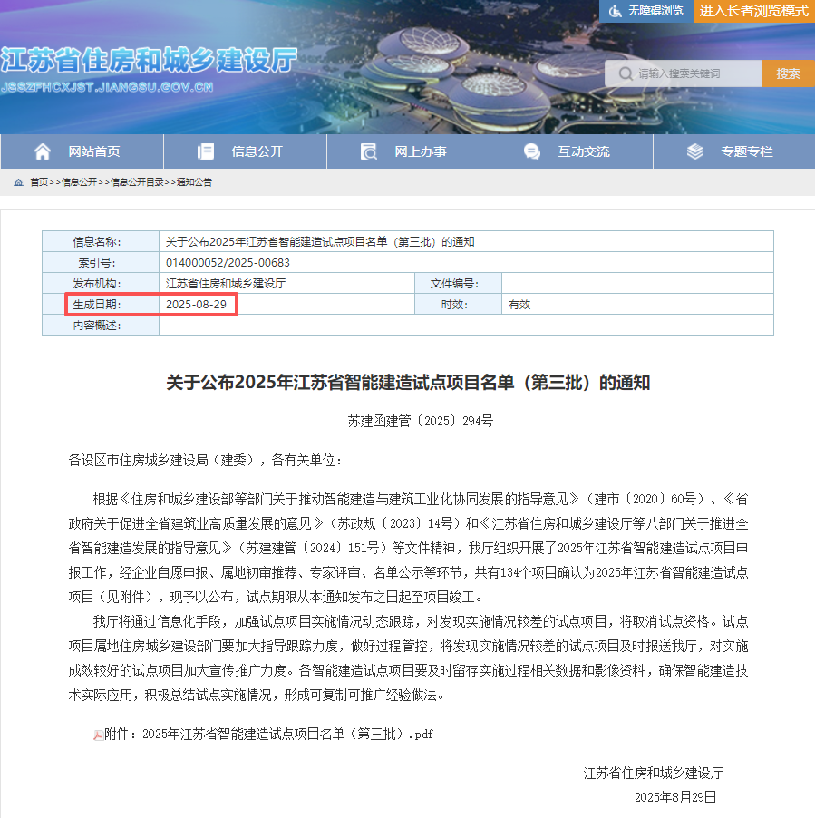 2025年8月29日,江苏省住房和城乡建设厅 《关于公布2025年江苏省智能建造试点项目名单(第三批)的通知》,共有134个项目确认为2025年江苏省智能建造试点项目,建筑机器人是项目核心应用技术之一。