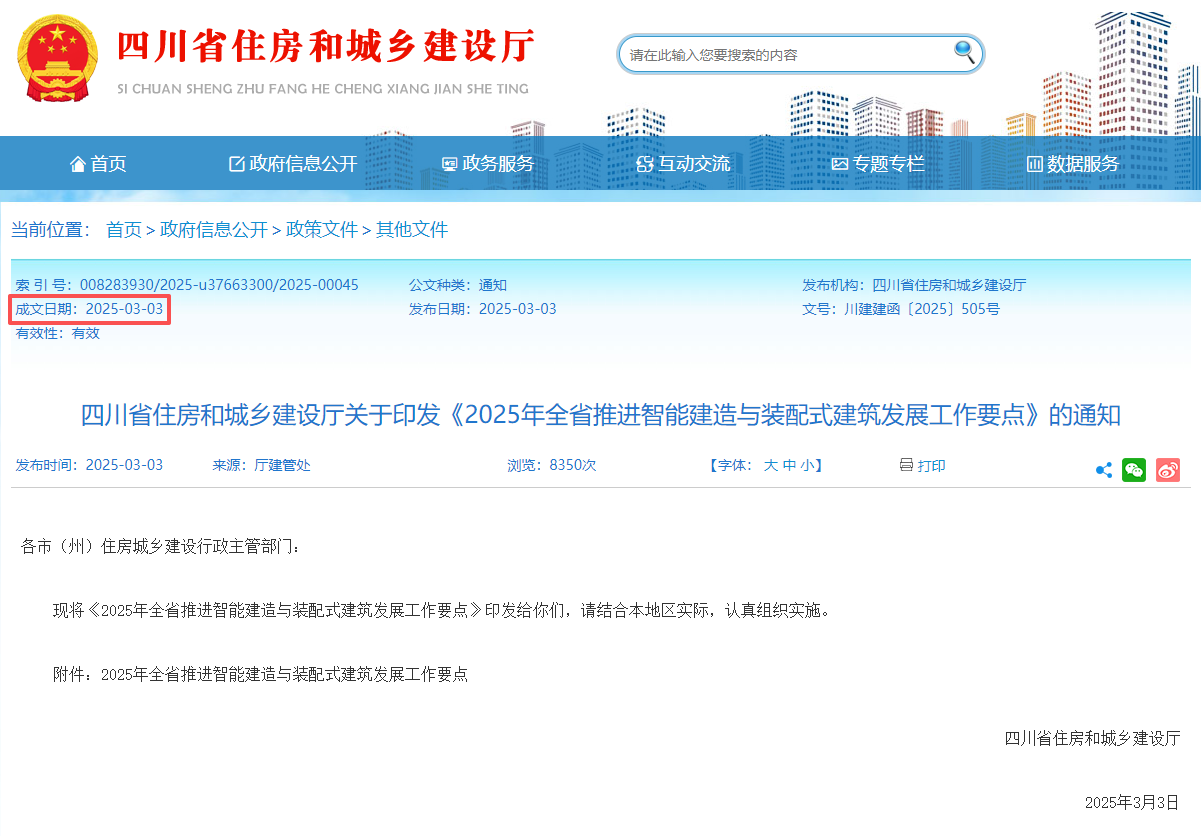 2025年3月3日,四川省住房和城乡建设厅关于印发《2025年全省推进智能建造与装配式建筑发展工作要点》的通知。2025年,全省新增智能建造试点城市3个、试点项目60个。持续推广应用智能建造技术,提升建筑业工业化、数字化、智能化水平,赋能“好房子”建设,努力打造“四川建造”升级版。