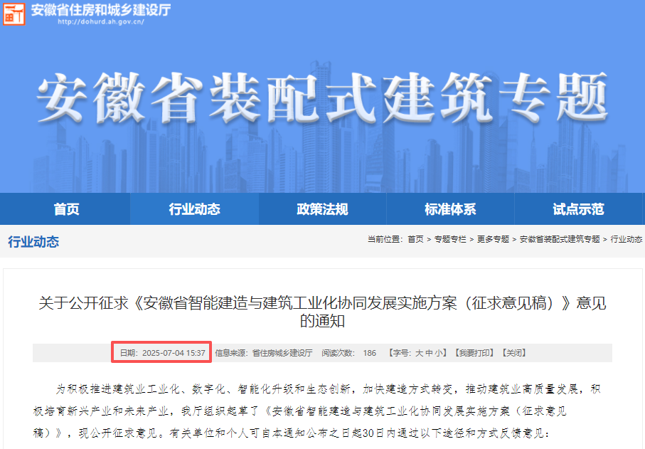 2025年7月4日,安徽省住房和城乡建设厅《安徽省智能建造与建筑工业化协同发展实施方案(征求意见稿)》,推动自动化施工机械、建筑机器人等相关设备集成与创新应用。企业自主或合作研发、购置使用智能建造重大技术装备可按规定享受企业所得税、进口税收优惠等政策。