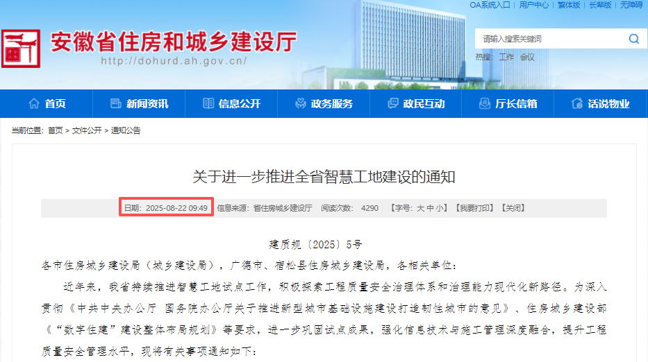 2025年8月22日,安徽省住房和城乡建设厅《关于进一步推进全省智慧工地建设的通知》,加快推广涉及施工安全的智能建造技术产品,替代“危、繁、脏、重”的人工作业,推动危大工程作业面“机械化换人、自动化减人、智能化无人”,加快形成施工安全领域新质生产力,淘汰危及安全生产的施工工艺、设备和材料。
